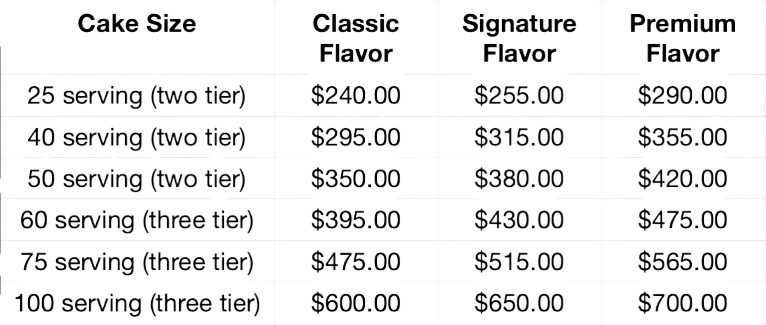 Please find our starting base prices & sizing below. Our list of flavors can be found on our Cake Flavors Page.