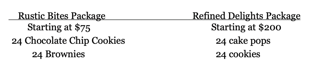 Our Rustic Bites packages are the perfect addition to any celebration. Featuring nostalgic, crowd-pleasing classics like chocolate chip cookies and fudgy brownies, this package brings comfort and charm to your dessert table.